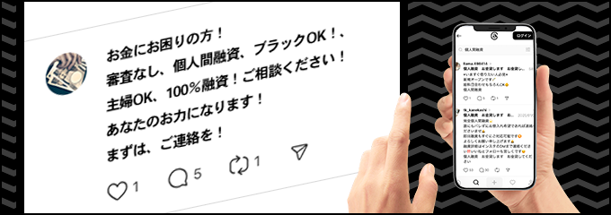 「#個人間融資」などのハッシュタグを使い、SNS上でお金の貸し借りを持ちかける手口が急増しています。これは、個人を装っているため警戒心が薄れがちですが、その実態は紛れもない闇金業者です。